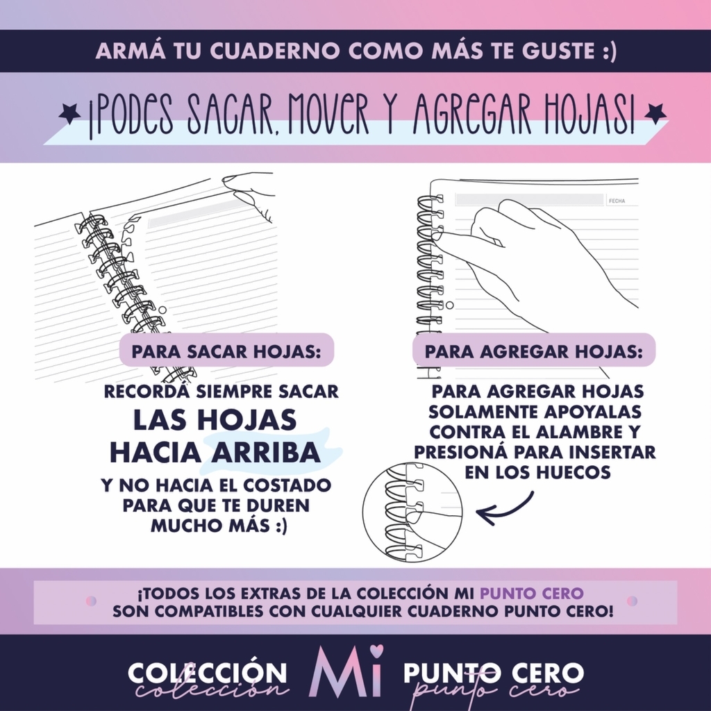 Importante! Todos los cuadernos de la colección Mi Punto Cero vienen con las hojas con la perforación especial que permite agregar, mover y sacar, al igual que todos los extras de la colección, pero los anillos no son intercambiables. Estos son de un tamaño grande para que el cuaderno pueda llegar a tener más de 120 hojas!